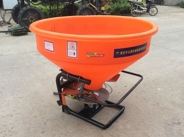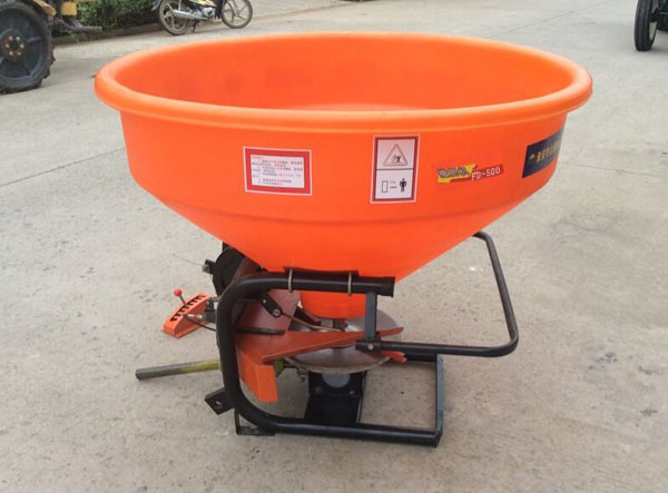 顆粒狀或球狀化肥經(jīng)人工倒入,進(jìn)入機具的肥料斗箱,通過(guò)手動(dòng)肥料調節控制桿,肥料落入撒肥盤(pán),撒肥盤(pán)做旋轉運動(dòng),通過(guò)旋轉離心力將肥料以圓周狀形式拋至土壤表面。